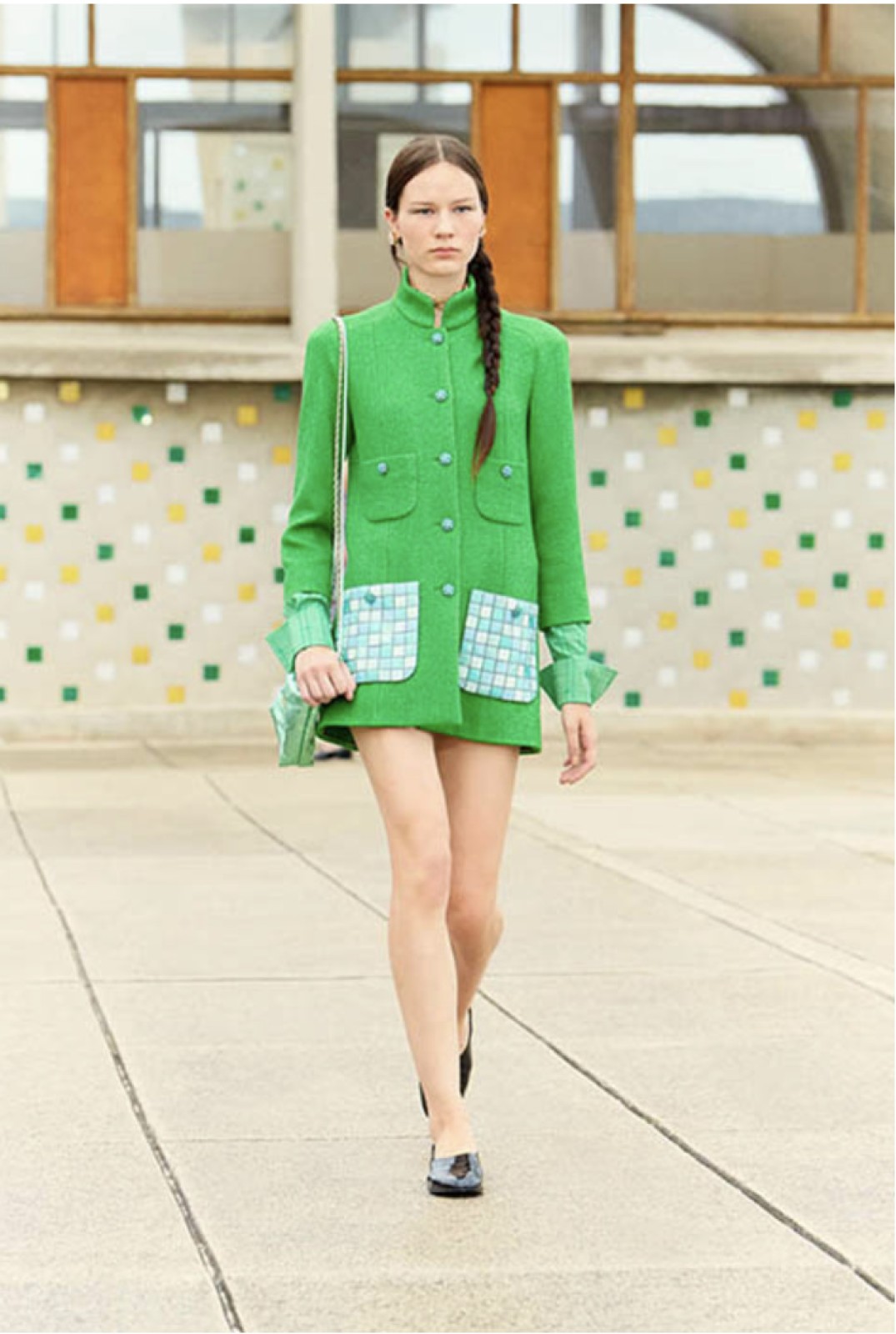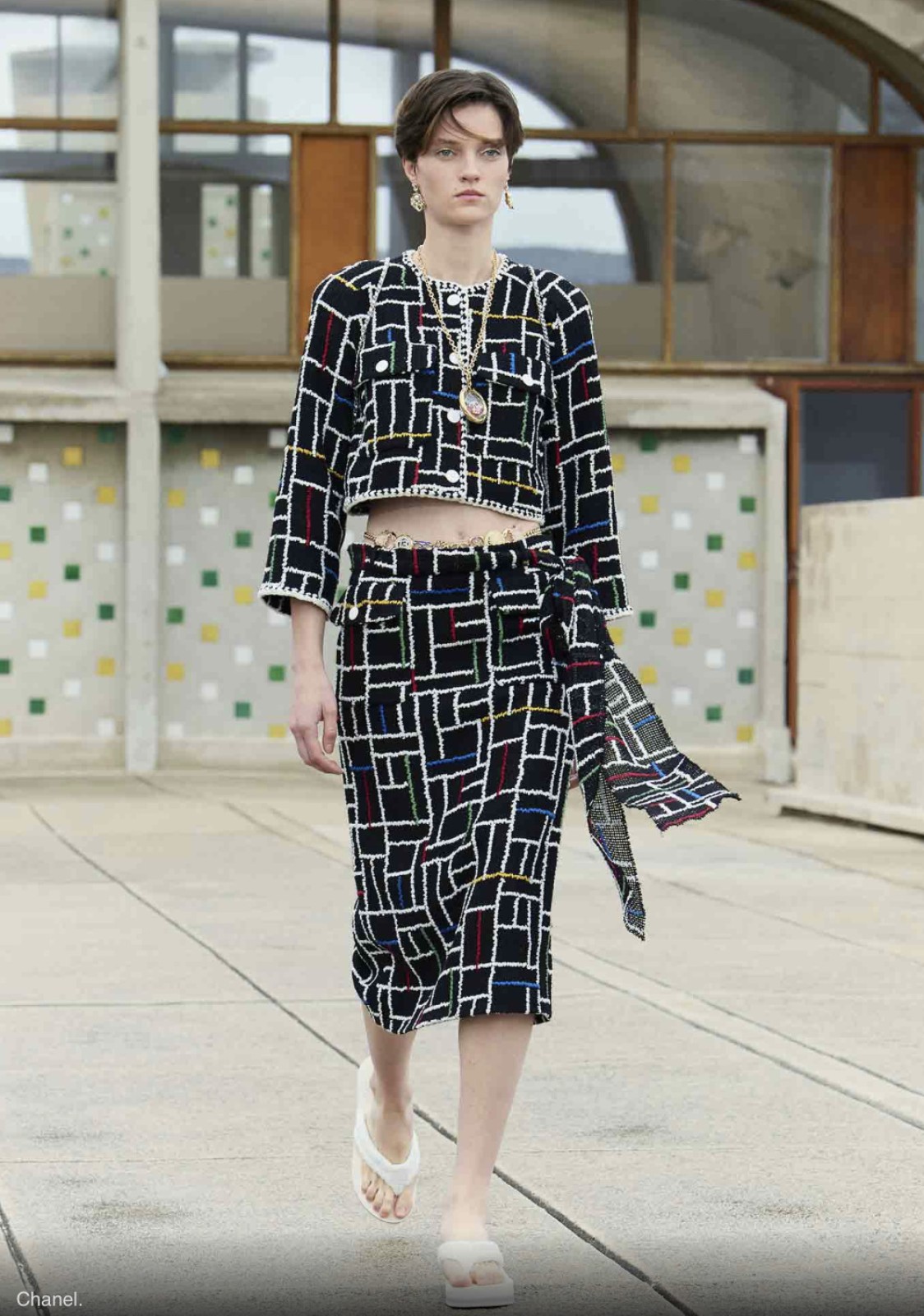 Quant aux défilés, un sur le toit en matinée et le second dans les couloirs du Jardin d’hiver, certaines pièces, aux motifs quadrillés et aux couleurs primaires, ne cachent pas leur référence au bâtiment de Le Corbusier et son décor en béton coloré. Ultimes témoins de ce beau jeu de face-à-face entre une collection résolument optimiste et cette architecture emblématique qui symbolise le vivre ensemble.