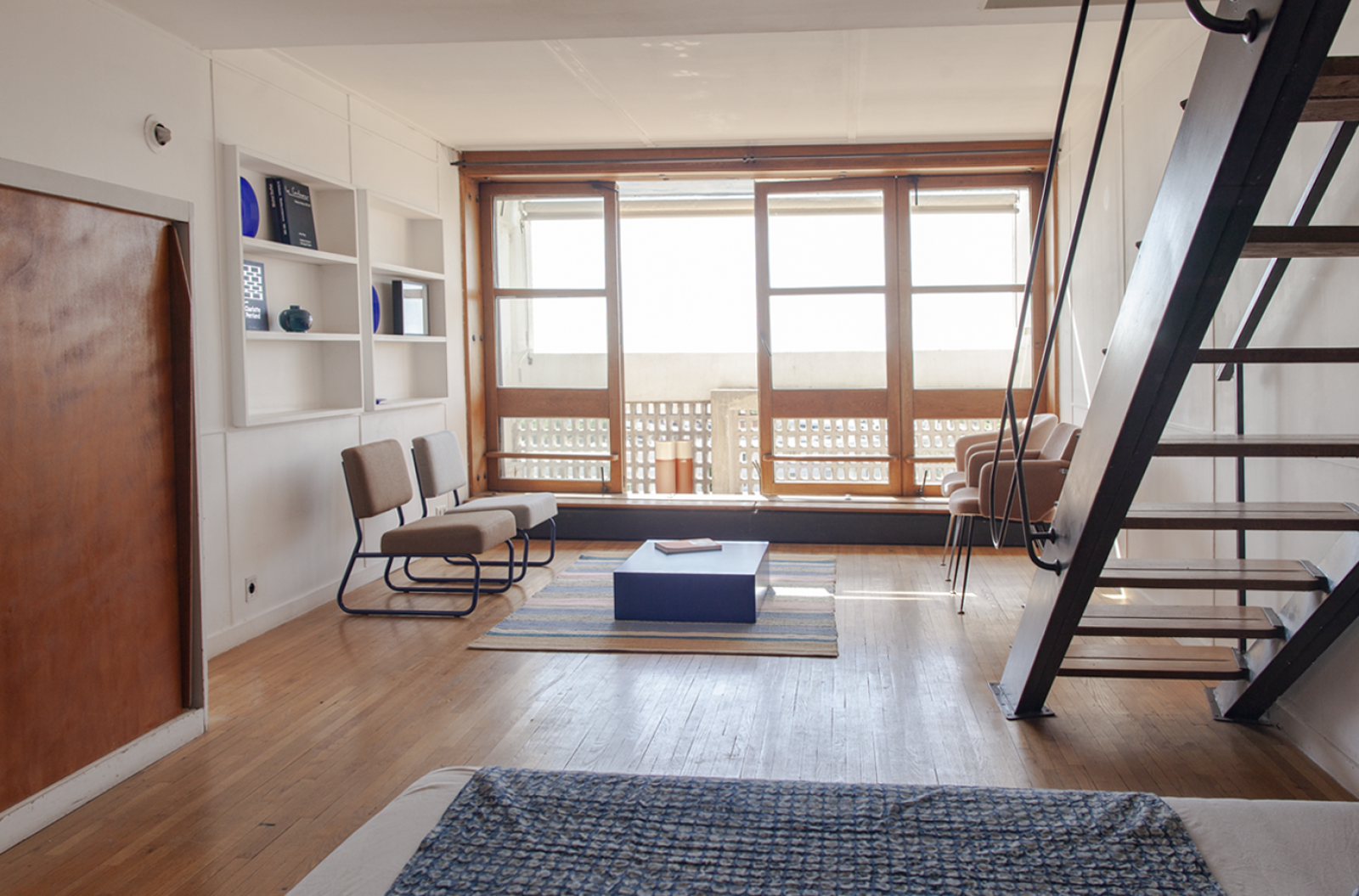 Avec les quelques pièces de mobilier sur place et l’appartement laissé en l’état, Maison Mirbel s‘amuse à composer et créer des espaces de vie simples et efficaces tout en valorisant cet appartement type C de Le Corbusier.