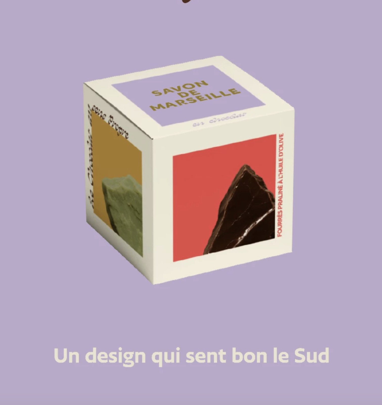 Le SAVON DE MARSEILLE en chocolat reprend les codes de la savonnerie traditionnelle : un emballage cubique en carton, un lettrage doré sur fond lavande évoquant la Provence et l’univers de la parfumerie, ainsi qu’un estampillage en relief dans la matière.