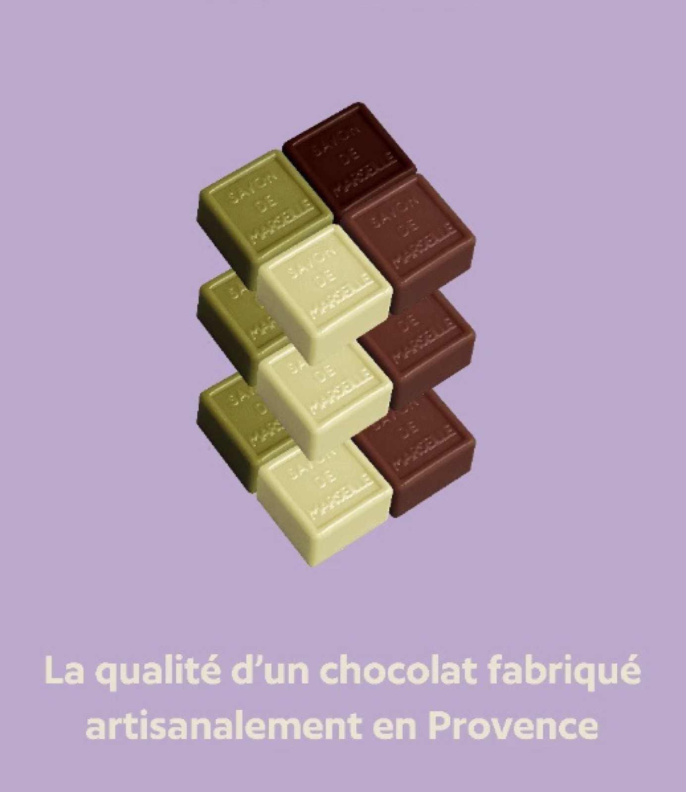 Le SAVON DE MARSEILLE en chocolat reprend cette icône populaire pour la transformer en objet de dégustation.