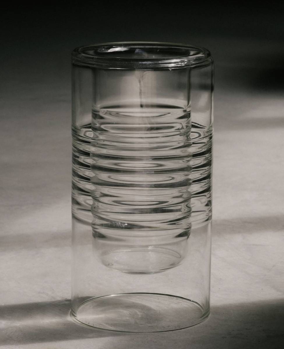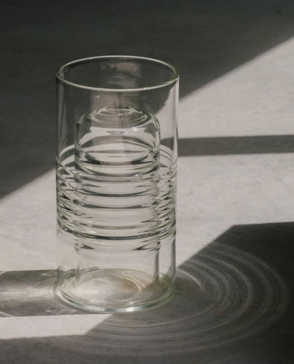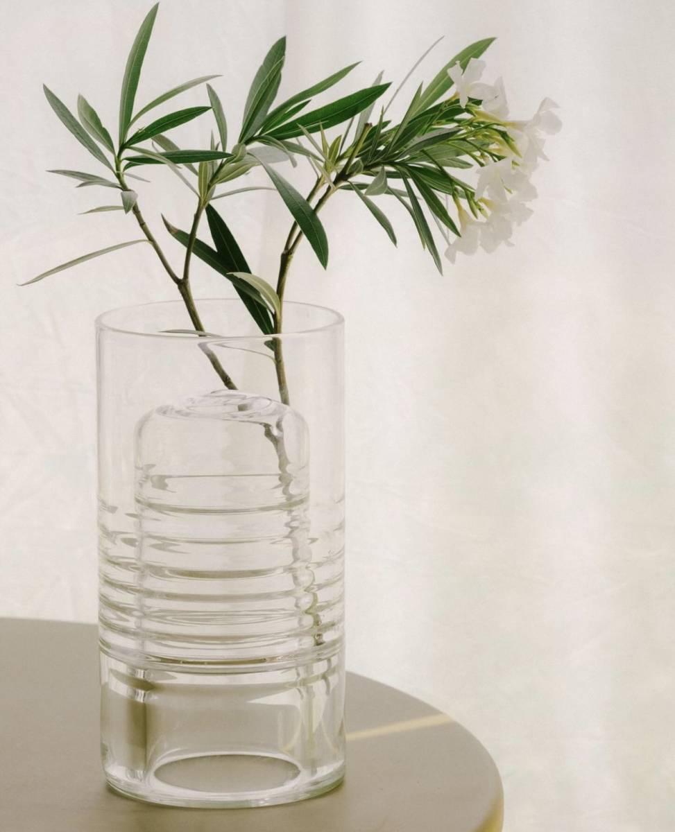 Nathalie Dewez présente chez Maison Mirbel son "Vase 24 double position" en verre ondulé transparent, comme un effet d'eau.